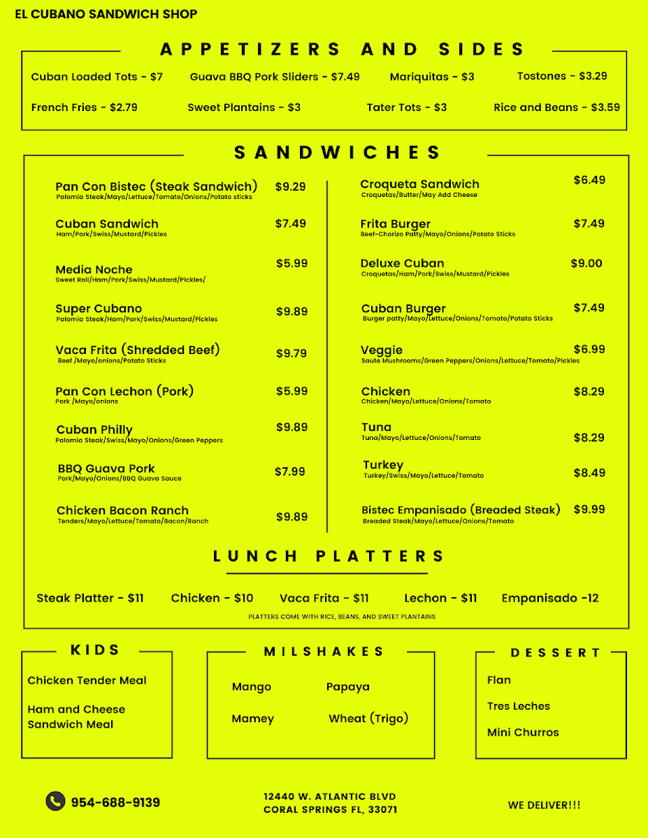 Welcome to El Cubano Sandwich Shop on Atlantic Blvd, a delectable destination in Coral Springs, FL. With a menu bursting with authentic Cuban flavors, it’s a feast for the senses!